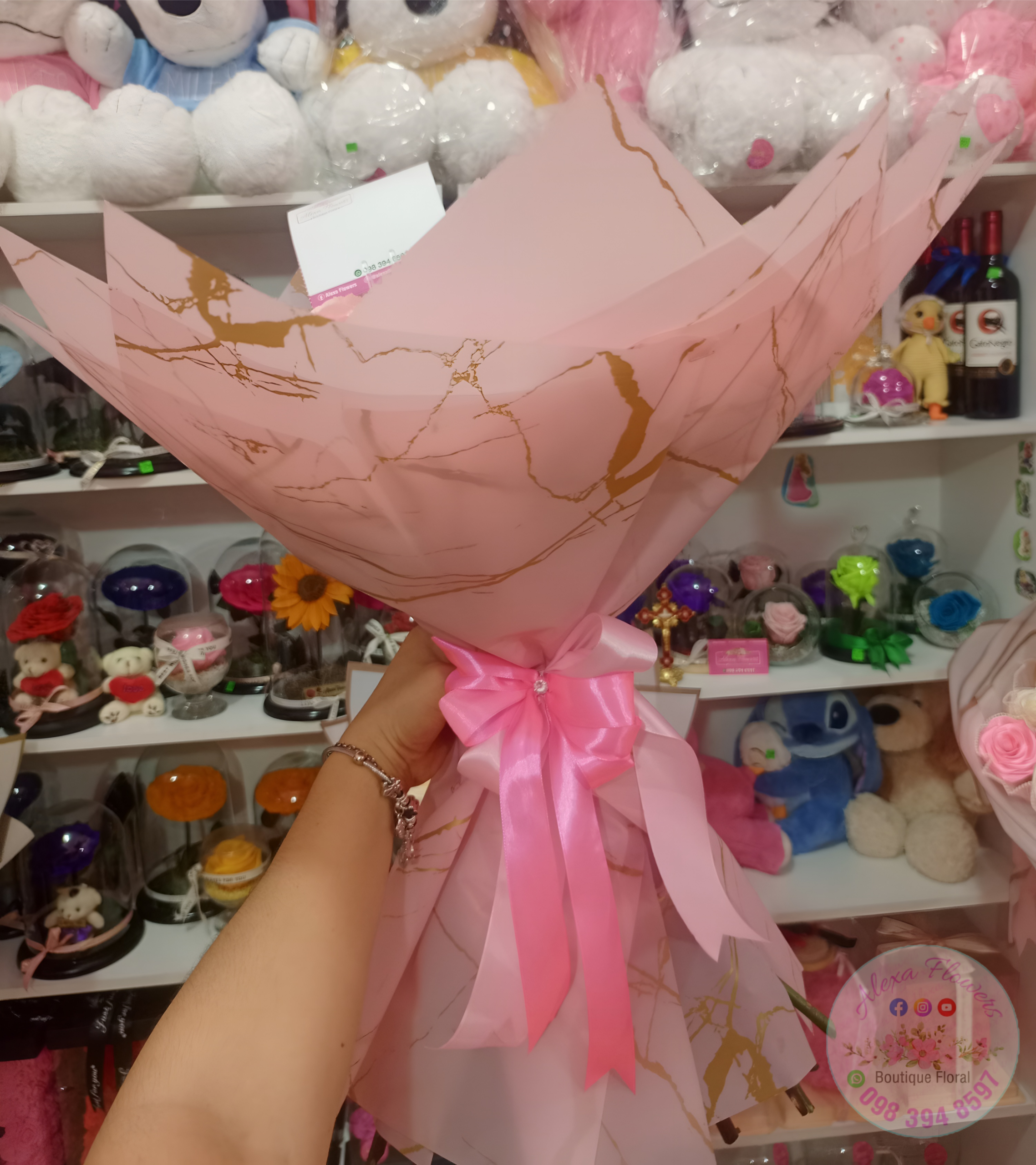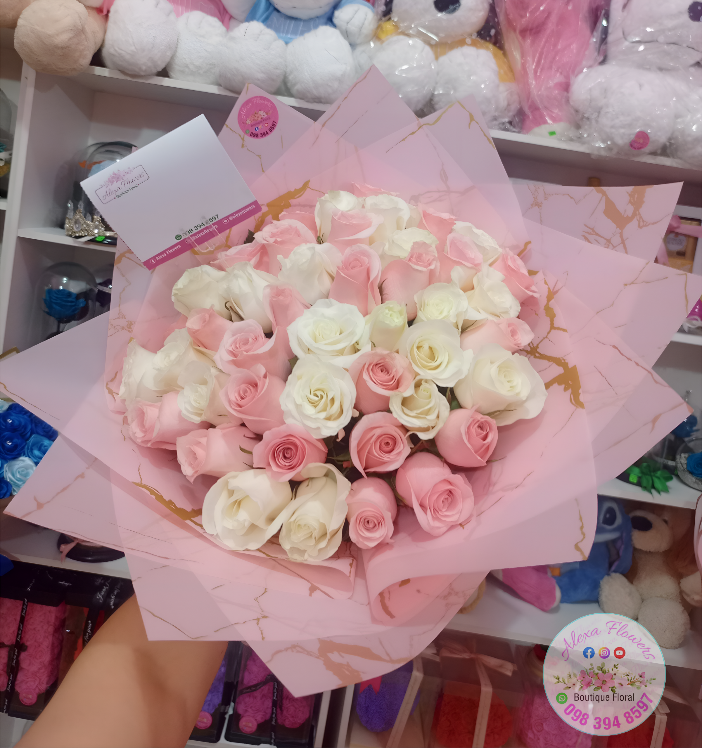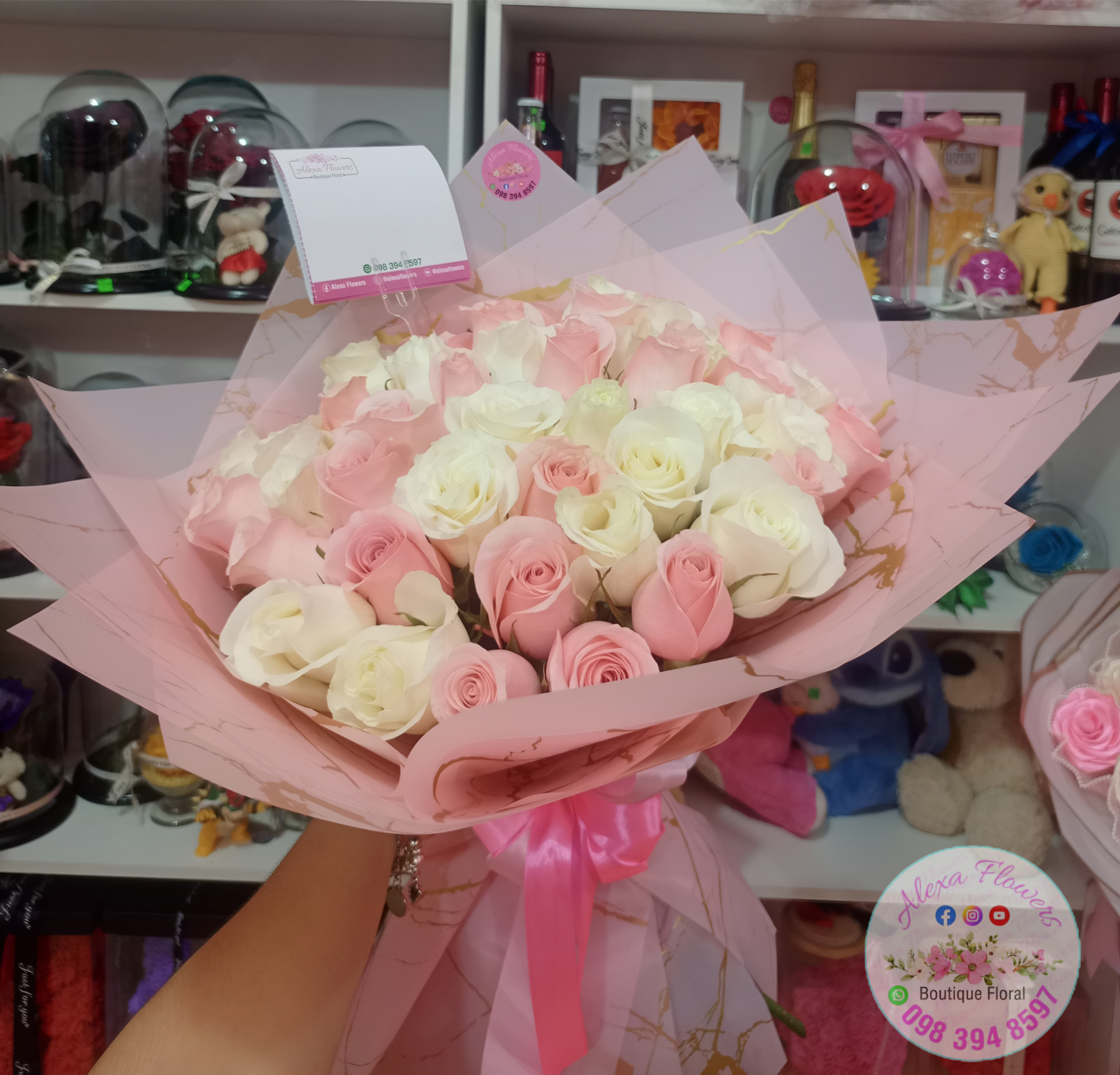 Elegante Bouquet de 50 Rosas Blancas y Rosadas (VARIEDAD DEL BOTON DEPENDIENDO EL STOCK DISPONIBLE)