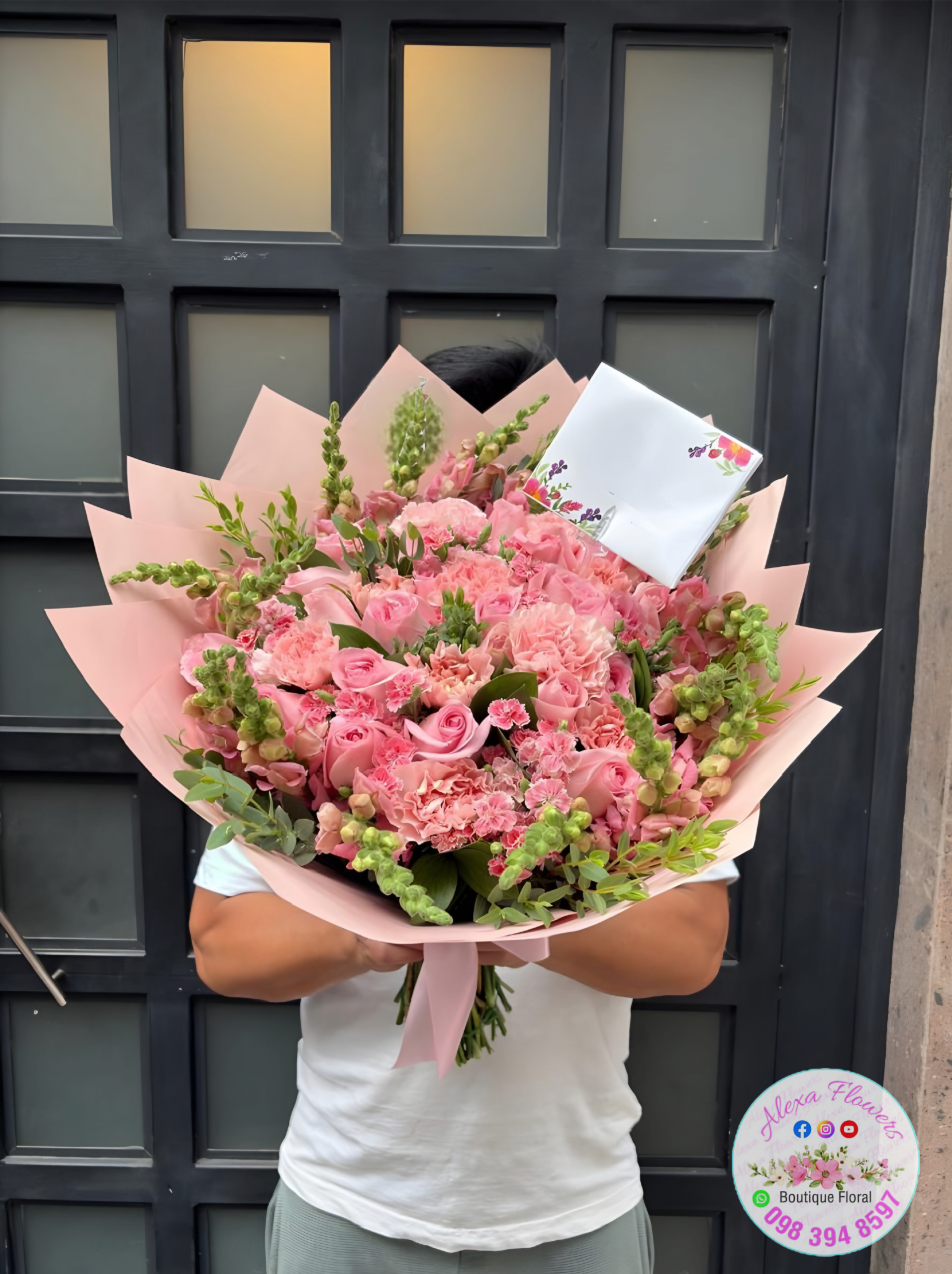 Elegante Bouquet de 24 Rosas, claveles, clavelinas, perritos, eucalipto.