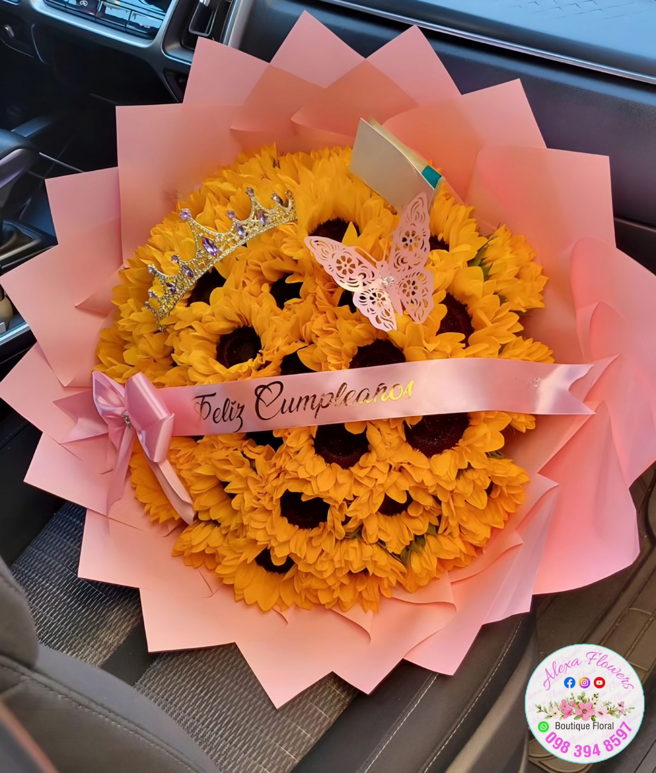 Elegante Ramo de girasoles, liston personalizado, corona metálica, mariposas