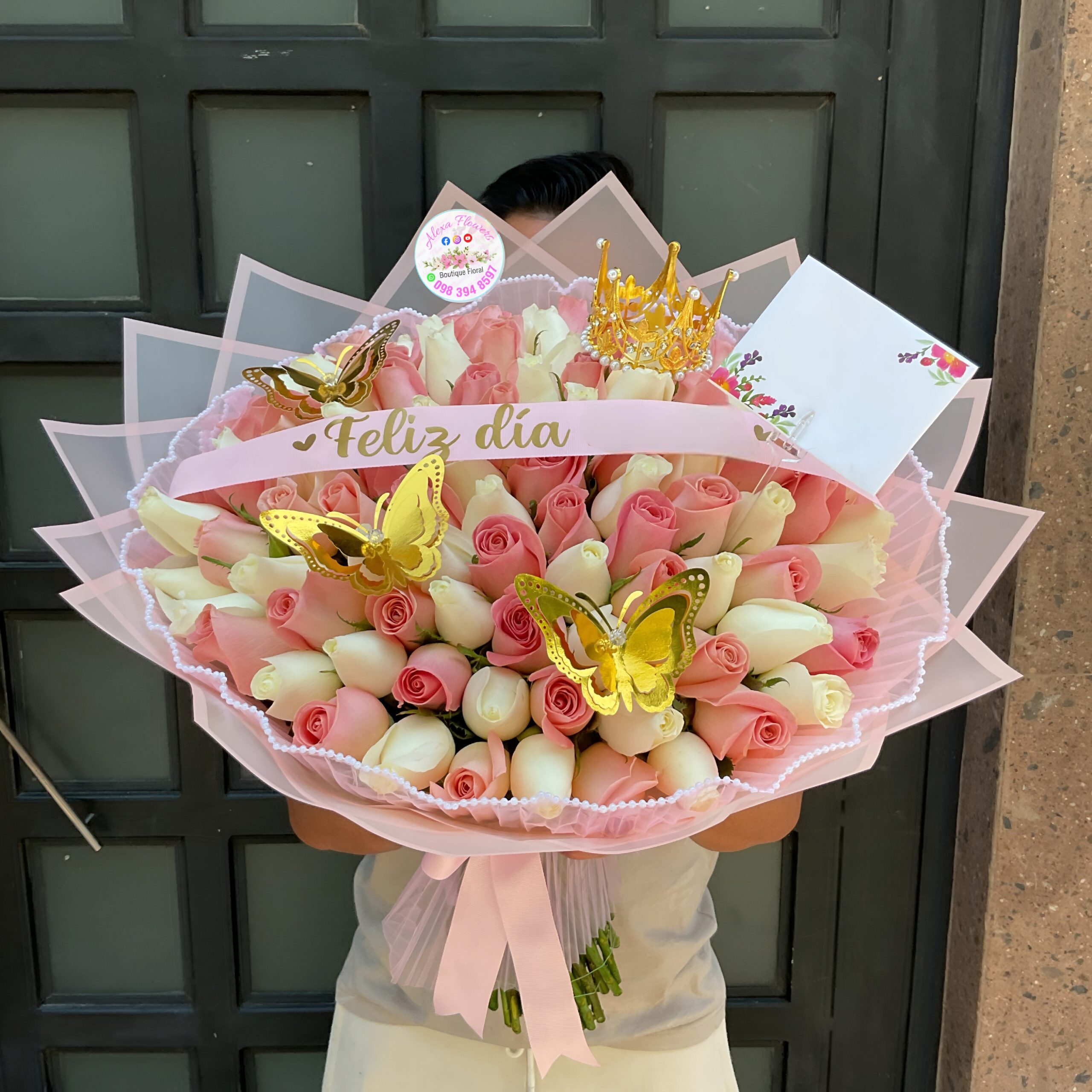 Elegante bouquet de 100 Rosas, liston personalizado, corona, mariposas gratis tarjeta dedicatoria