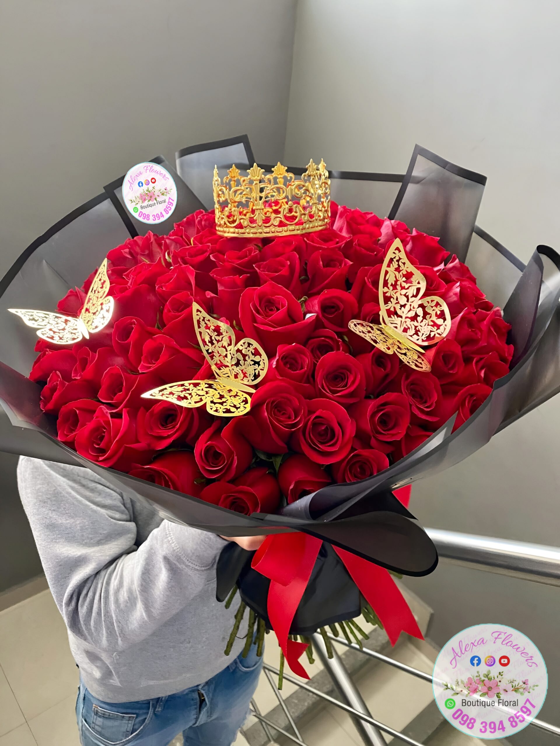 Hermoso Bouquet de 100 Rosas rojas , corona metálica y mariposas.
