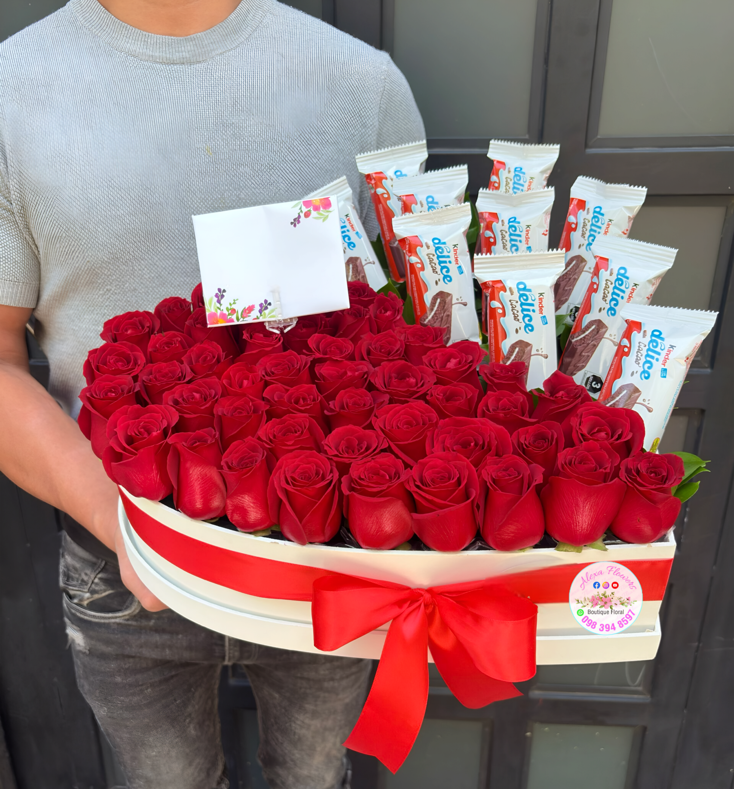 Elegante box de corazón con 50 Rosas rojas más 10 chocolates kinder barra