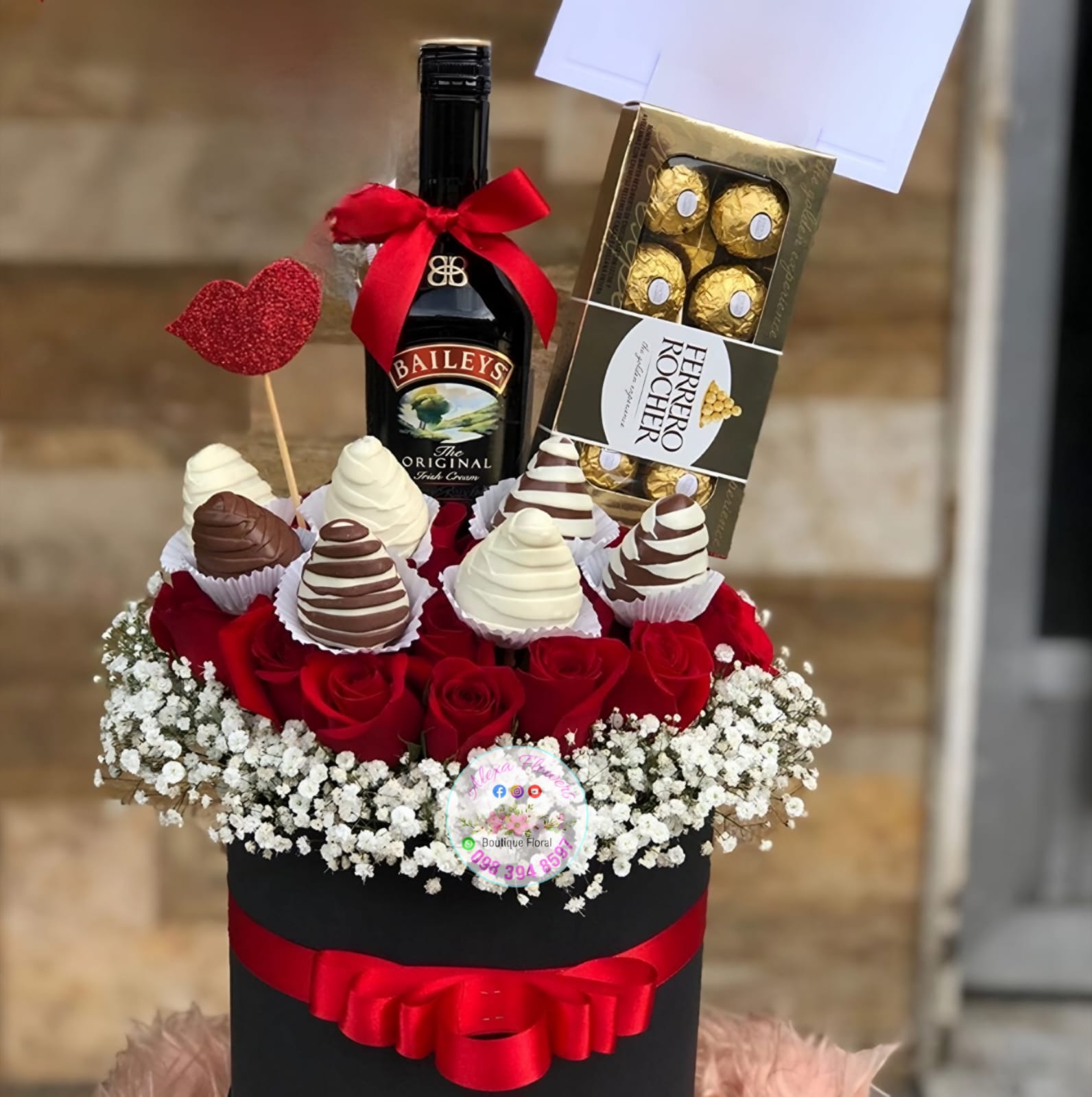 Elegante Box de 24 Rosas rojas con aliento de bebe, Ferrero por 8 unidades, 8 Fresas, una botella de licor de Baileys.