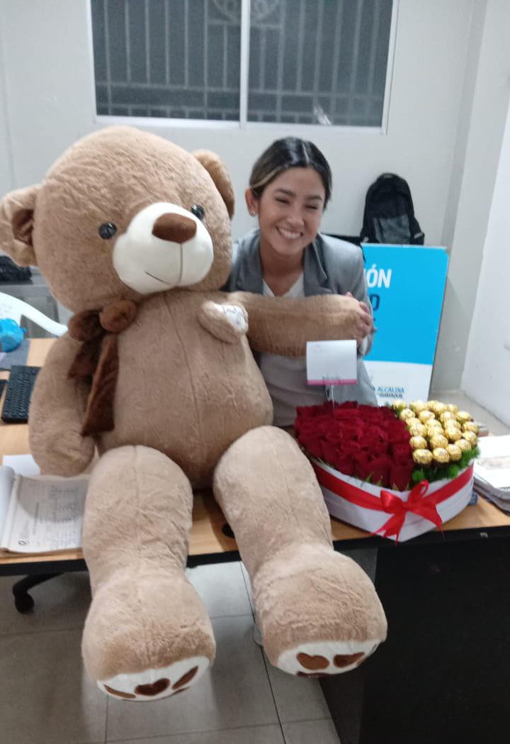 Elegante arreglo floral corazon con 50 Rosas, 30 chocolates ferrero, peluche gigante de 1.50mtrs