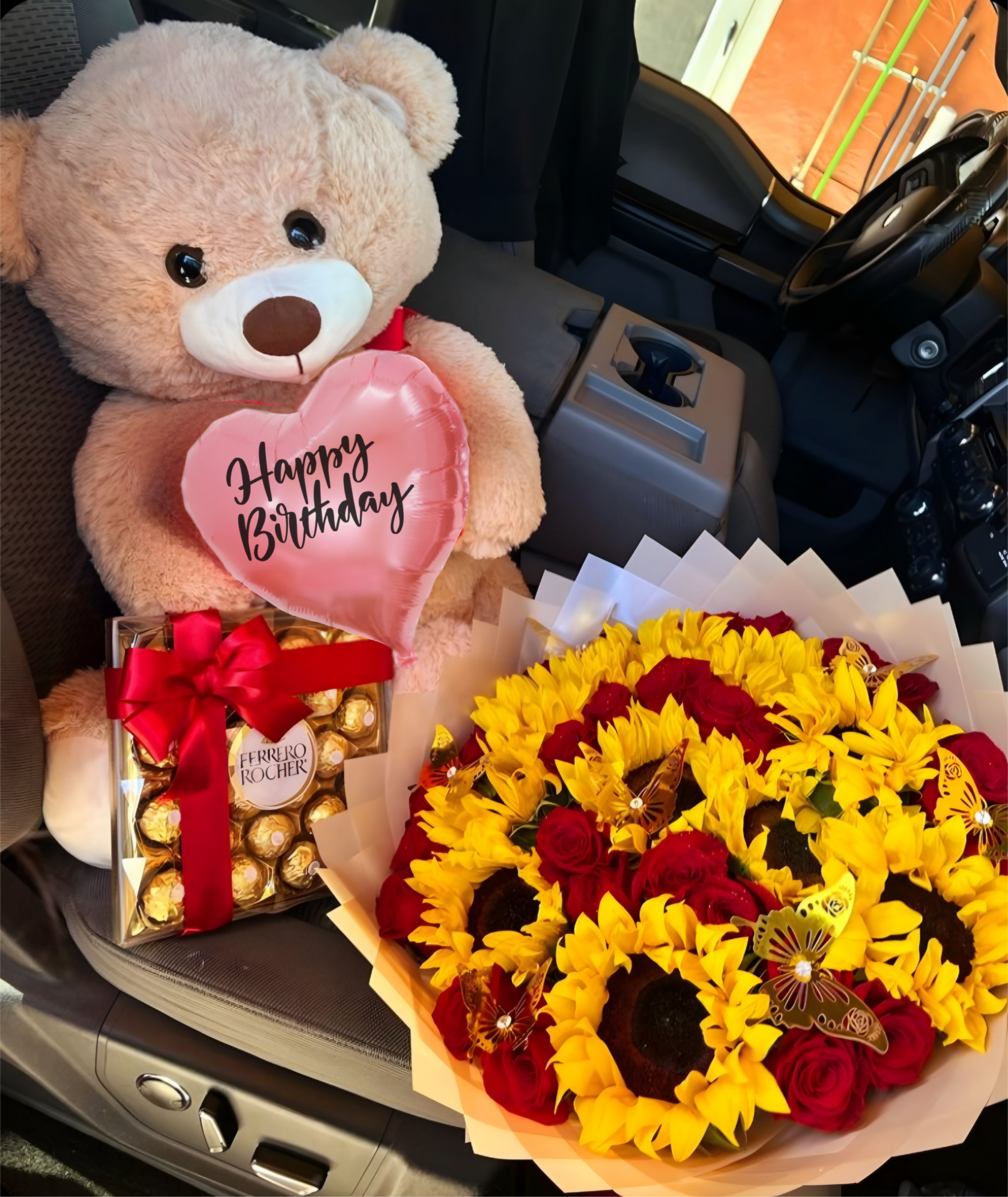 Peluche de 80 cm con 24 chocolates Ferrero, 15 girasoles, 24 rosas rojas y globo metalizado